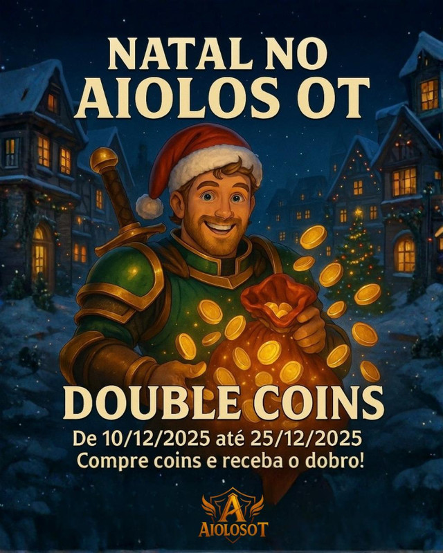 Pra fechar o ano daquele jeito, a partir do dia 10/12/2025 todas as compras de coins vão valer o dobro até 25/12/2025!Comprou coins?Recebe o dobro direto na conta.E fiquem ligados: em breve vamos lançar o evento especial de Natal do Aiolos OT, com muitas novidades !Aproveitem o clima de Natal e já avisem os amigos pra ninguém perder a promo.Bom jogo a todos e boas festas! |