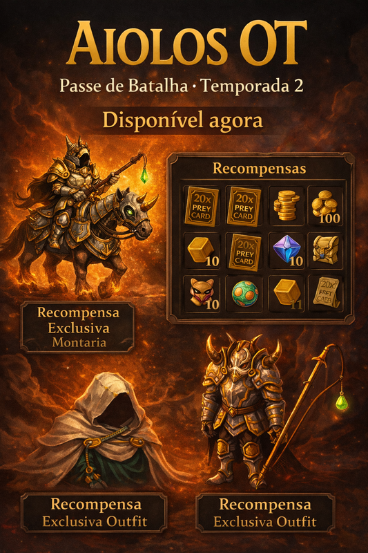 Battle Pass Temporada 2Com o mesmo funcionamento que o anterior trazendo diversas novas e exclusivas recompensas! Serão 3 recompensas exclusivas obtidas somente por esse passe. Special Fishing Rod - Vara de pesca que aumenta 20x mais rápido o skill de pesca que a fishing rod. Champion Horse - Montaria linda exclusiva perfeito para charlovar. Golden Shine Warrior - Outfit exclusiva do passe que além de ser linda adiciona um bônus de +5 de skill (melee, distance ou ML), shielding e fishing! O preço será 60 tc.